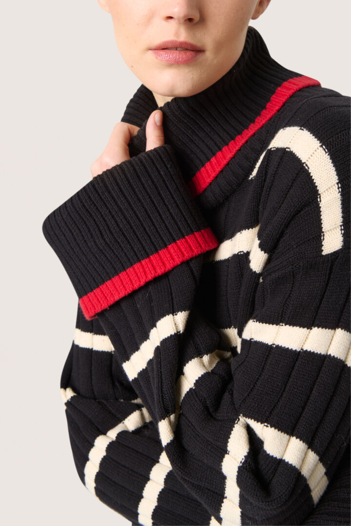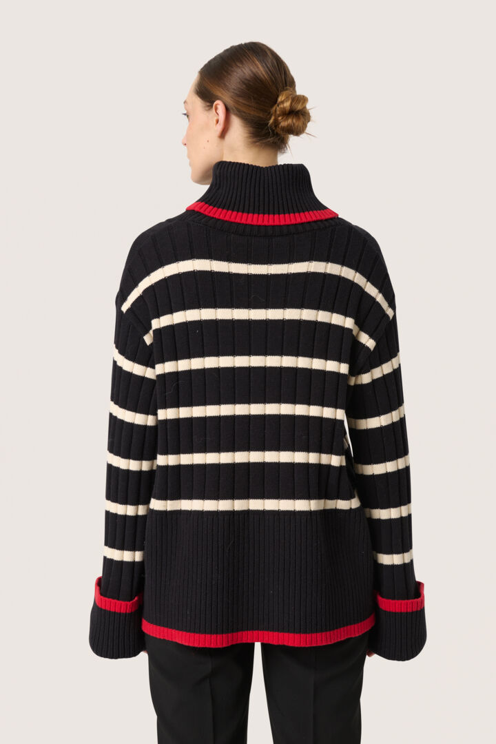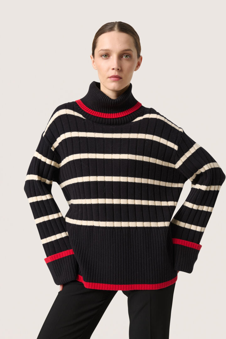Knitted sweater with a high neck, long sleeves, and a striped pattern. The sweater features ribbed details and contrasting colors at the edges, providing a modern and eye-catching look.