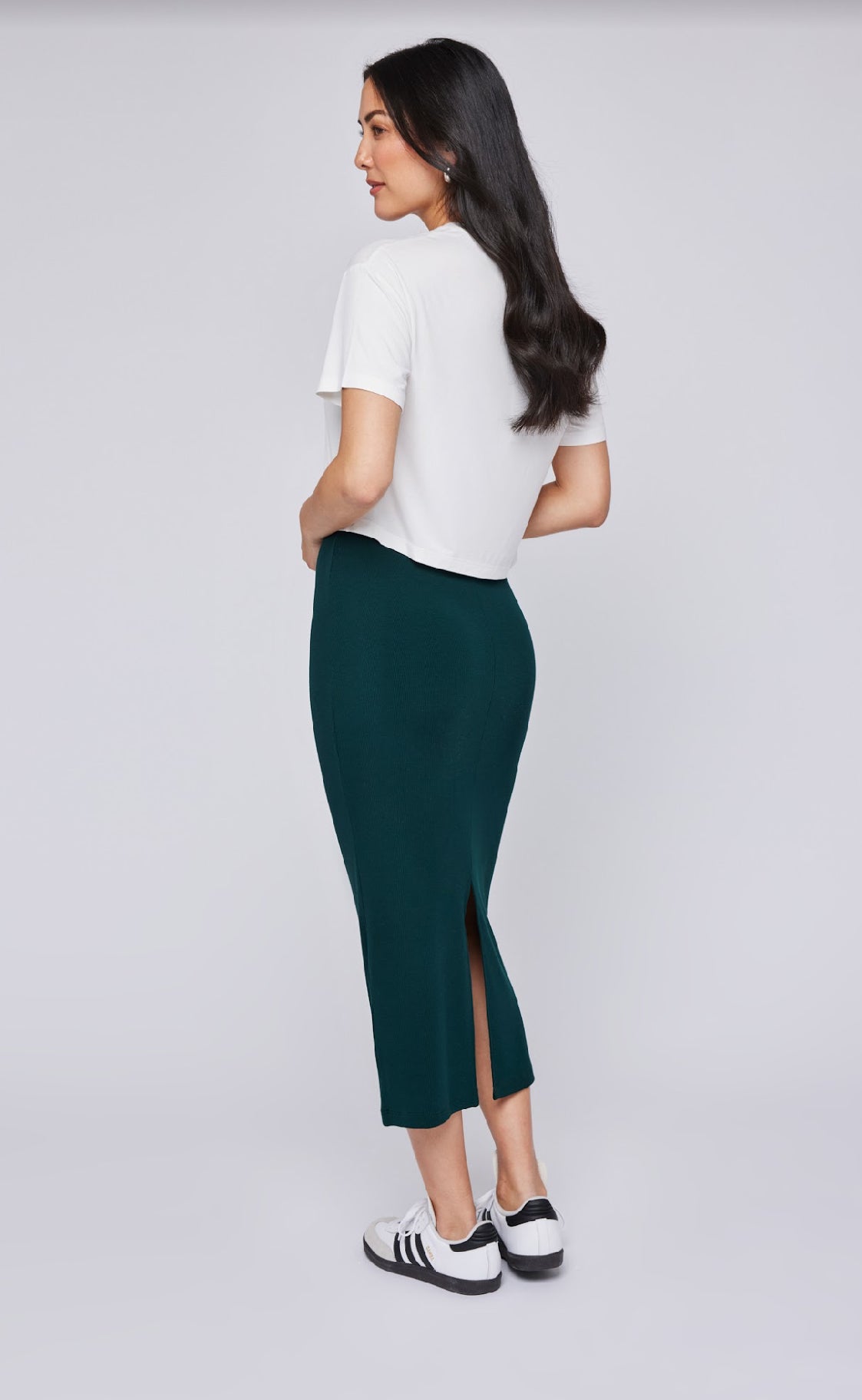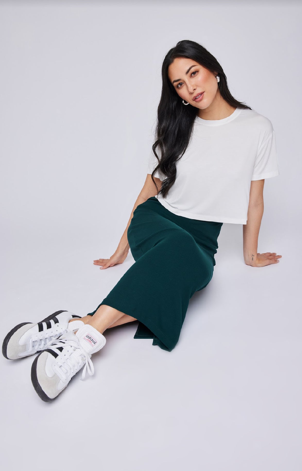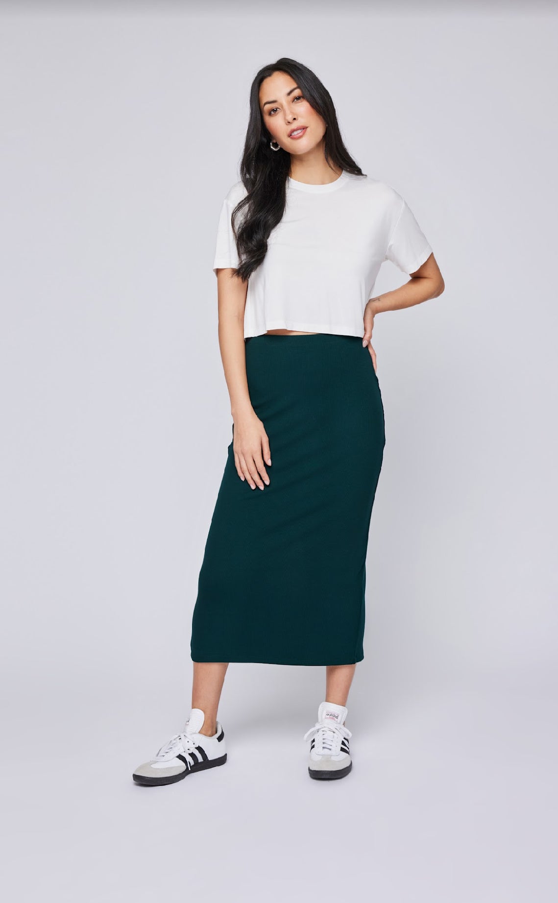The Sayulita skirt is made of a stretchy ribbed fabric that hugs the body. The effortless silhouette is perfect for everyday wear. Complete the look with the Suri tank top.