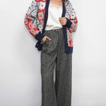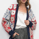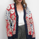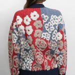 This long-line cardigan is crafted from a soft, chunky knit fabric in a rich indigo color with a distinctive mixed motif pattern. The design features a relaxed, oversized silhouette with dropped shoulders and long sleeves, creating an effortless and comfortable feel. The open-front design makes it perfect for easy layering over a variety of tops.