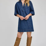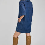 The Evelina dress is made of a denim fabric that has been specially washed for a perfectly lived-in look. Features include a collar with a v-neckline and side seam pockets.
