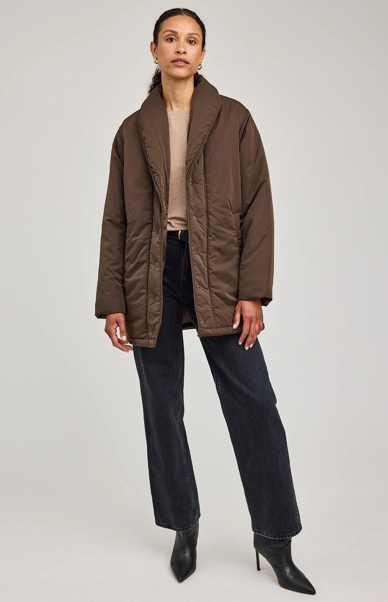 The Davis coat is made of a nylon fabric with the perfect amount of fill to keep you warm and cozy. Features include a front snap closure, shawl collar, and welt pockets.