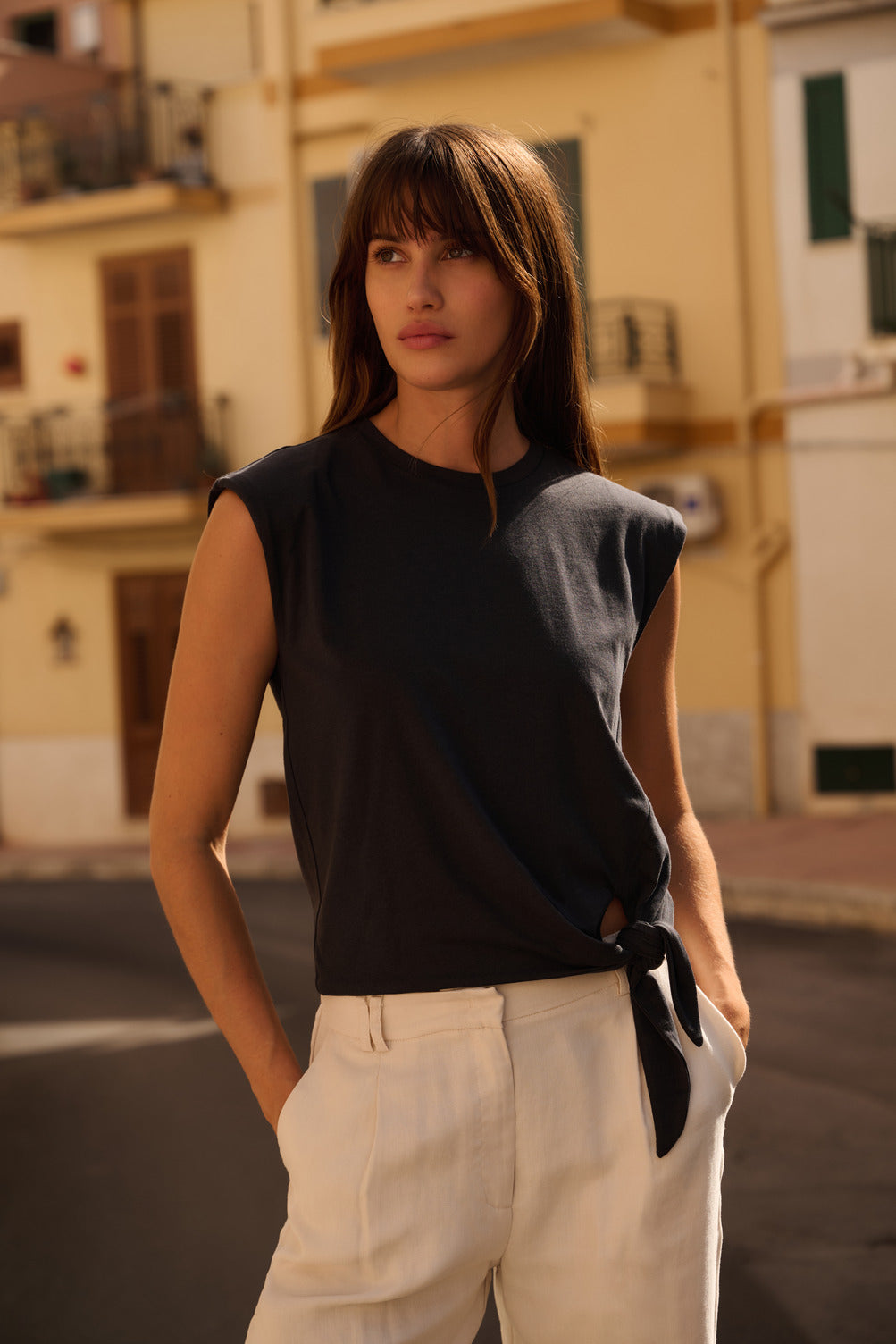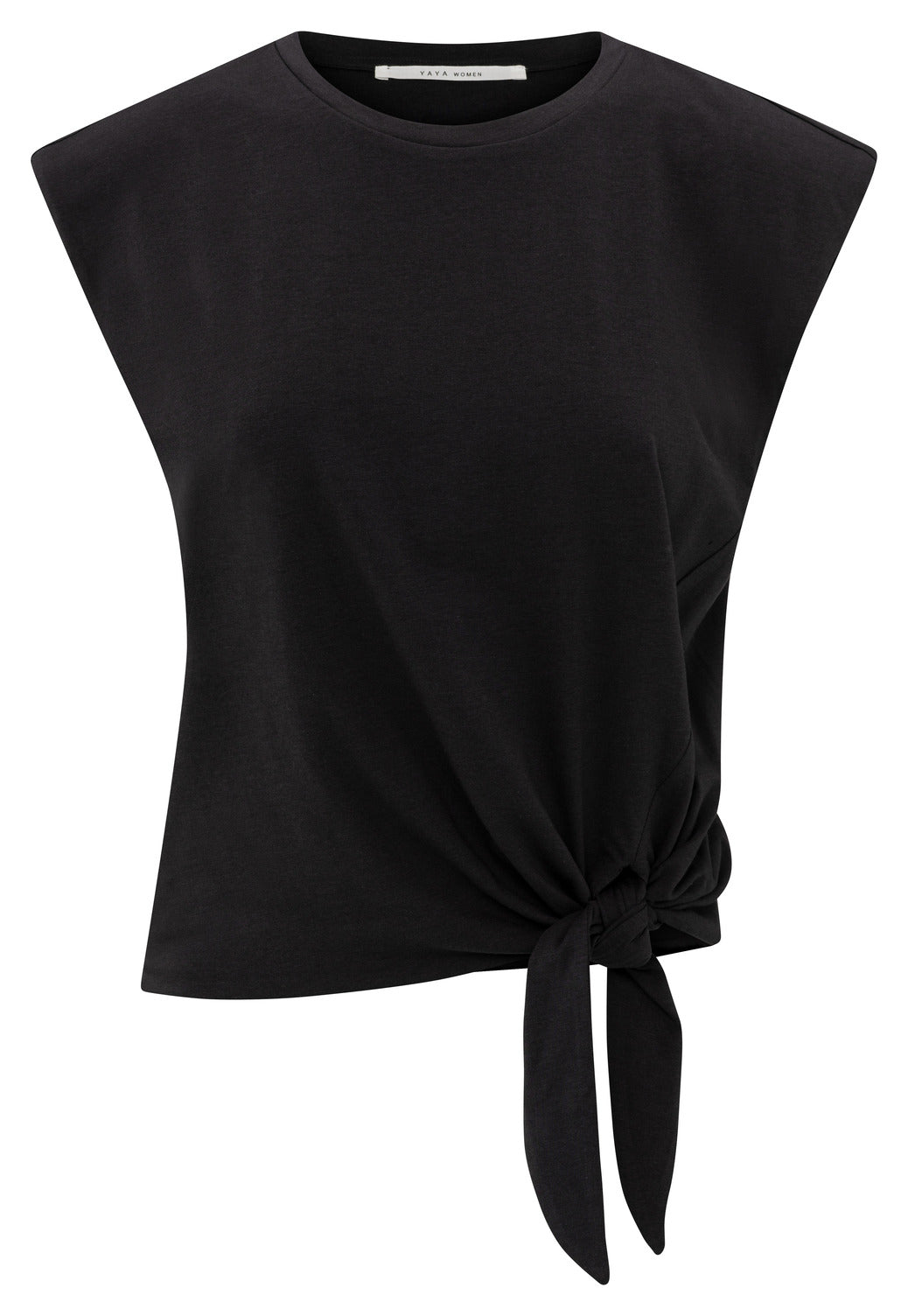 This stylish sleeveless top is made from a soft, fluid fabric and features a round neckline and a fitted fit. The asymmetric knot detail at the side adds a playful and flattering touch. Perfect to pair with high-waisted trousers or a skirt for an effortlessly chic look. The model is 178 cm and wears size S.