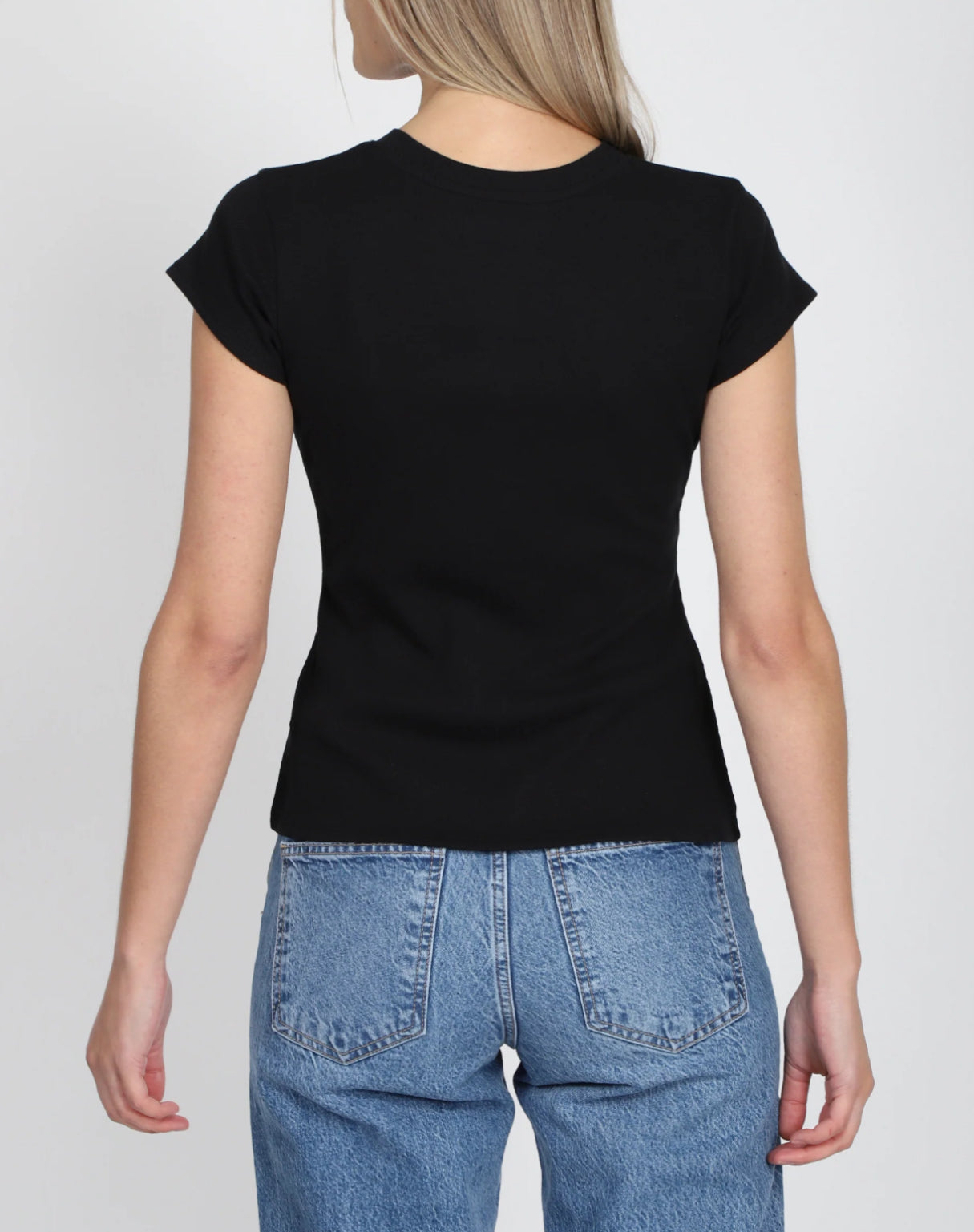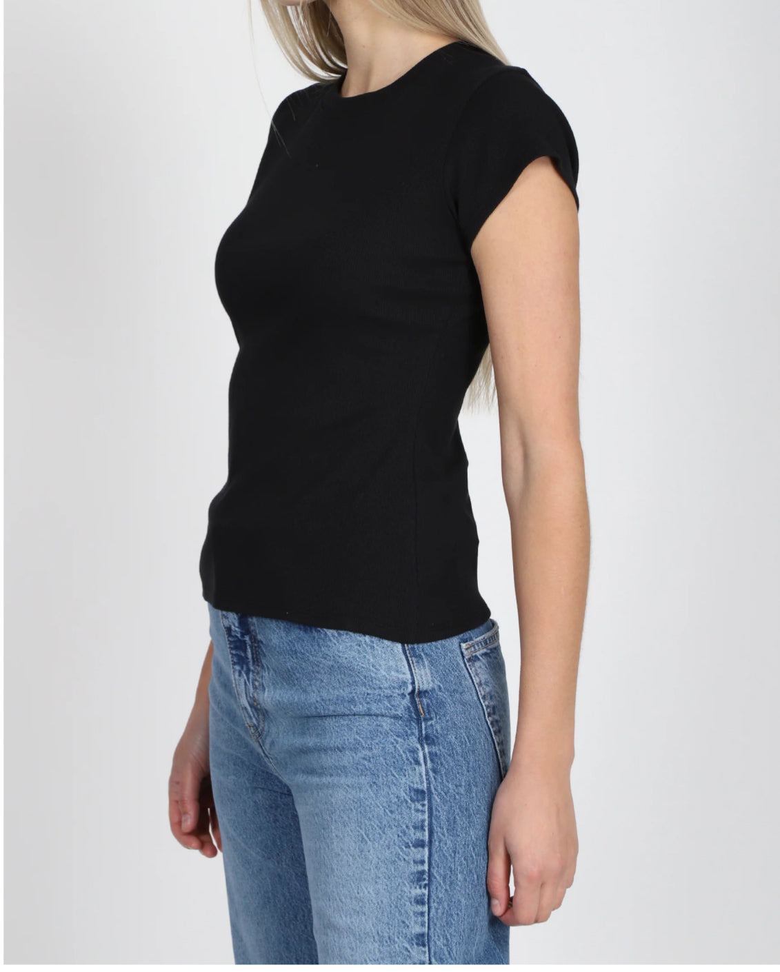 Our Ribbed Tee has a fitted body and hits below your hips.