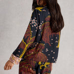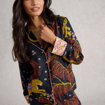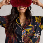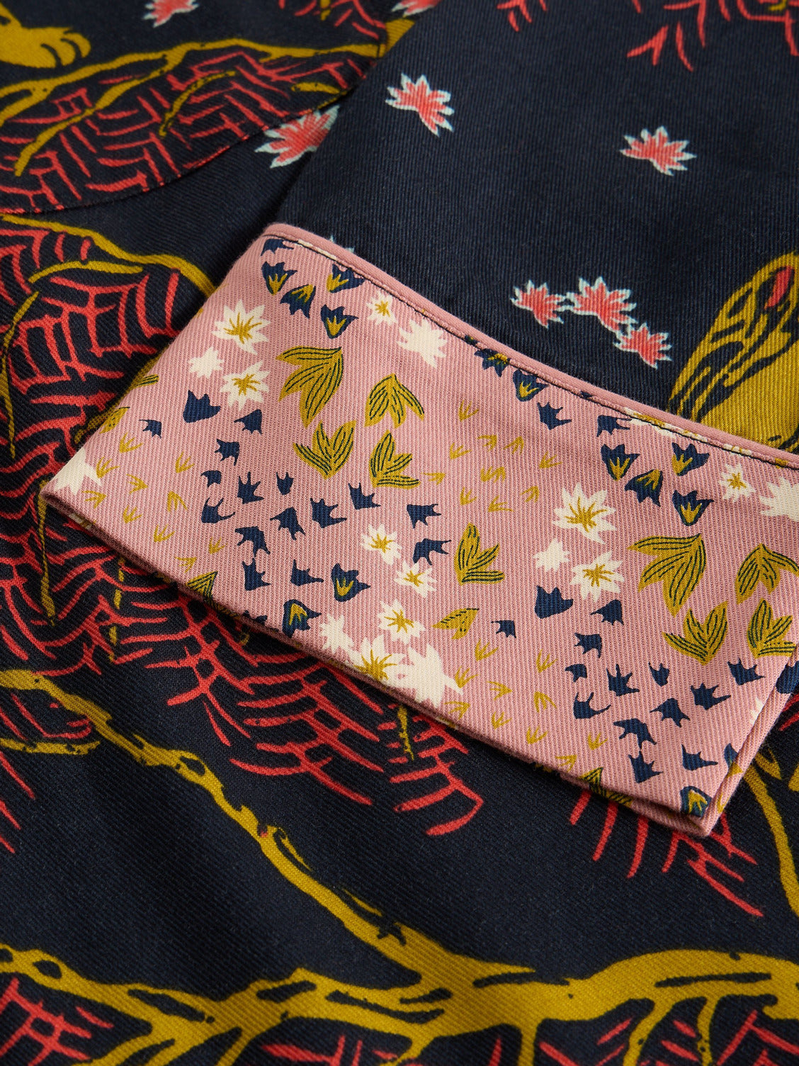 A pyjama shirt with a contrasting print on the cuffs, a little colour pop and embroidery details. Add the matching bottoms and consider this your excuse to lounge.