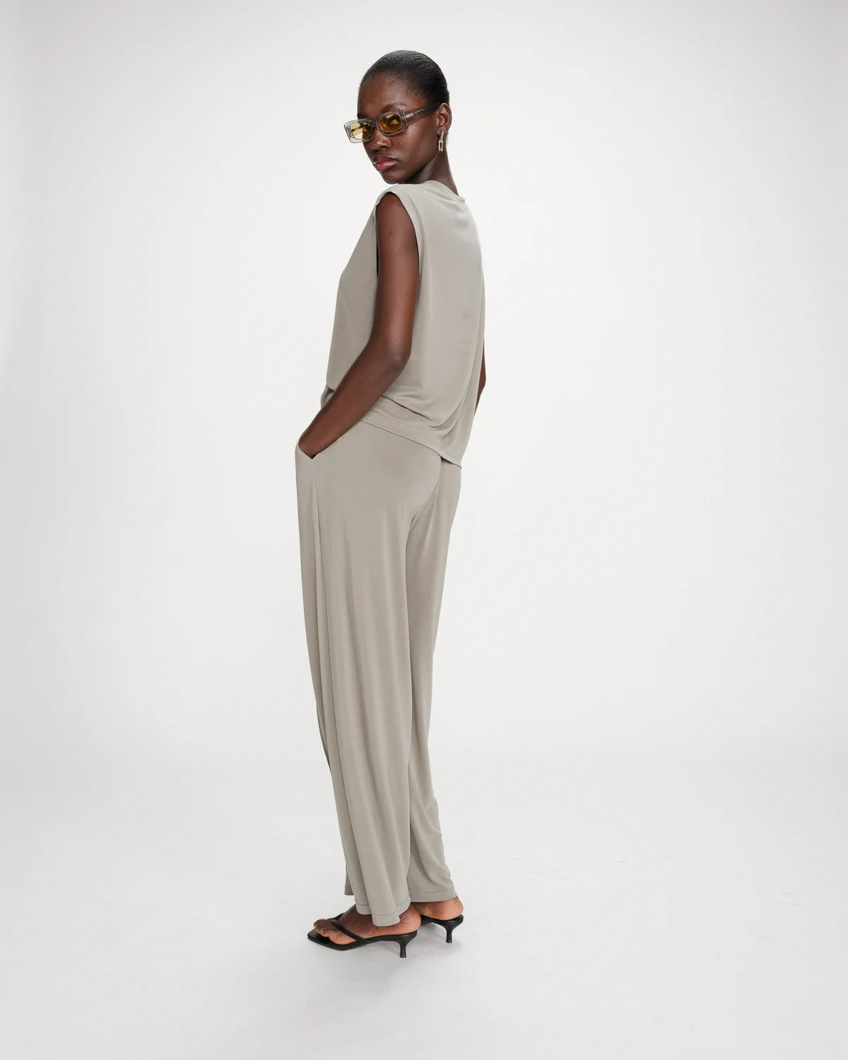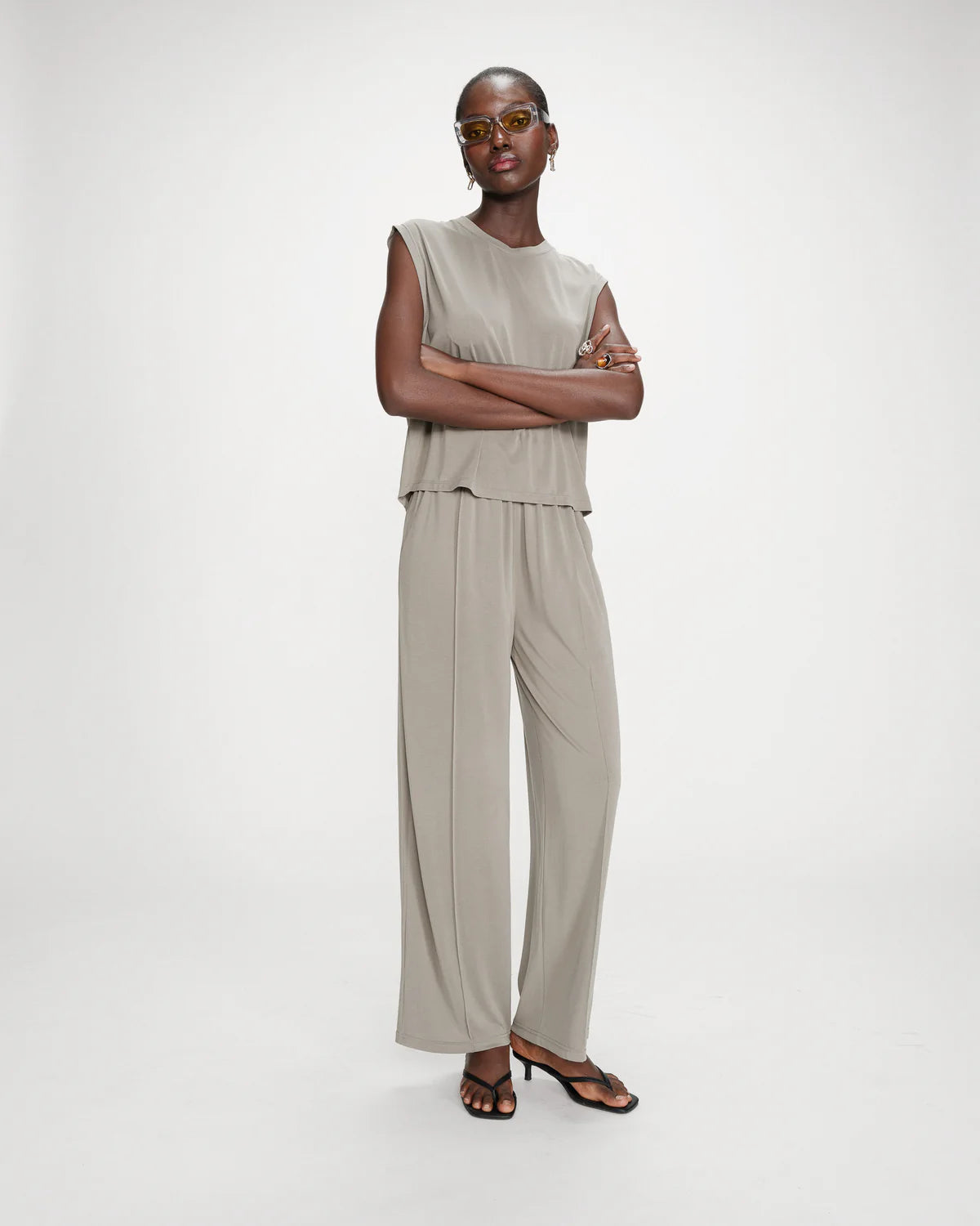 Complete the look: The RIMBAUD sleeveless top is worn with PAX straight pants for a structured look and timeless everyday style.