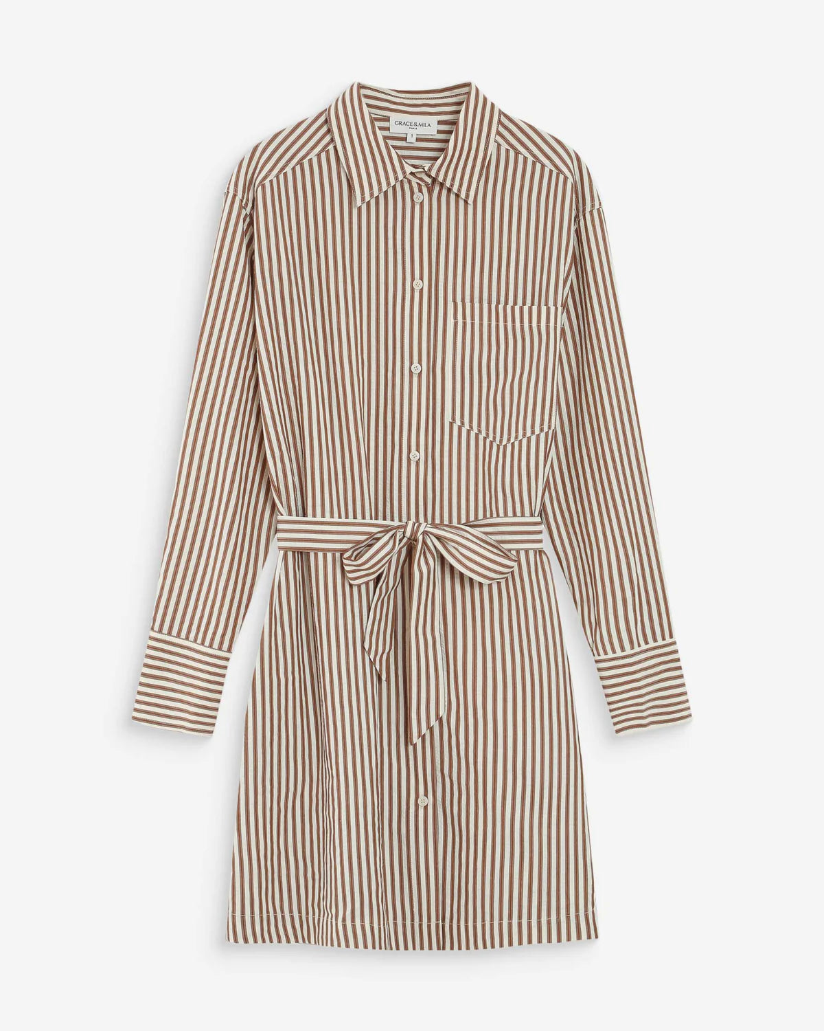 Product information: - Short striped shirt dress - Straight cut - Long sleeves with buttoned cuffs - Classic shirt collar - Waist belt and belt loops - Patch pocket on the left chest - Buttoned front placket